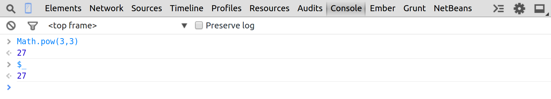 $_ re-evaluates the last expression and is similar to the ‘_’ command in python’s REPL. However _ prints the last ‘non-None’ value while $_ prints the value of the last evaluated expression even if it is undefined.