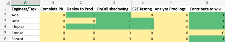 - Collate the most common tasks that all engineers do regularly. This effort should culminate in a checklist of tooling, processes and practices that newbies need to master to become independent.