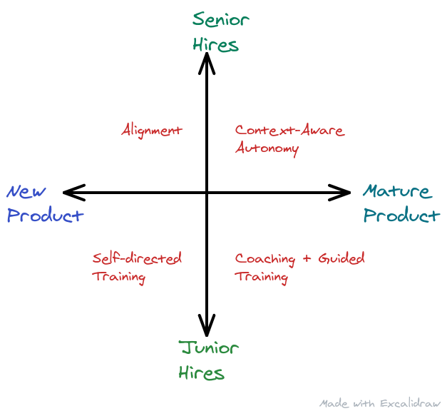 This scenario is slightly different from the new product since folks have to learn about the technology and ramp up on the existing patterns, debt, and gaps. Unlike new products, mature products usually operate at a less urgent pace and have a mix of maintenance and new feature work. The tension here lies in equipping the newbies with domain-specific skills without slowing down the entire team to a halt.