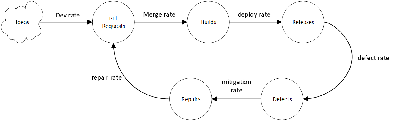 The software delivery pipeline similarly starts with requirements; these requirements are transformed into Pull requests (PRs), PRs are merged into builds, builds ship in releases and releases deliver value to customers. Like the misplaced car screw, an uncaught bug can quickly ruin a new feature. However, instead of massive recalls, most defects are fixed by shipping even more software (e.g. patches, upgrades, etc.).
