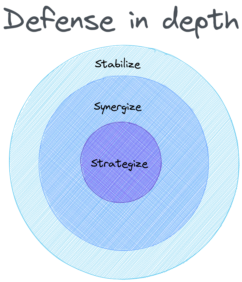 The stabilize, synergize, and strategize approach is a defense-in-depth strategy against the forces of chaos and disorder: you continuously withdraw to the next ring whenever a layer is breached, and it helps you keep your customers and engineers happy.