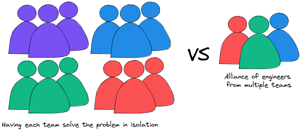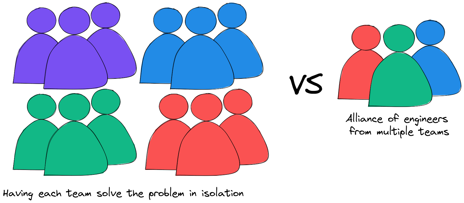 Having each team in the organization fund implementation in isolation is inefficient; it leads to repeated ramp-up cycles and the proliferation of bespoke solutions. A more efficient approach is to have a single driver who leads a virtual team to solve the problem efficiently in one broad swathe. The cost in this scenario drops to 5 people (1 director + 1 virtual team leader + 3 engineers), a 4x improvement in capacity costs! In addition to the efficiency, the driver’s higher impact and growth are extra benefits.