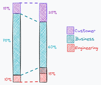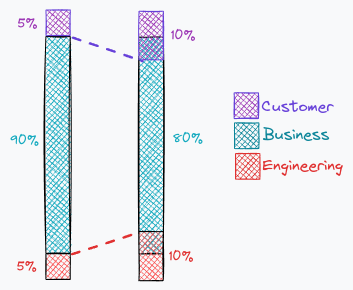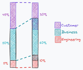 For v1 products, you must invest heavily in the business category to achieve product-market fit. For products going through hypergrowth, your primary focus should be retaining customers and maintaining the growth rate. Finally, if you have a mature product, you’ll need to allocate significant resources to engineering efficiency to reap the benefits of scale.
