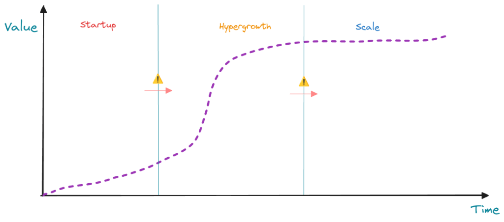 As the product gains traction and grows rapidly, sub-optimal decisions taken in phase 1 start to bite. Common symptoms include reduced engineering velocity, increased customer complaints, and scaling pains. In most scenarios, the rapid orders-of-magnitude growth exposes the tipping points in the team, architecture, and processes.
